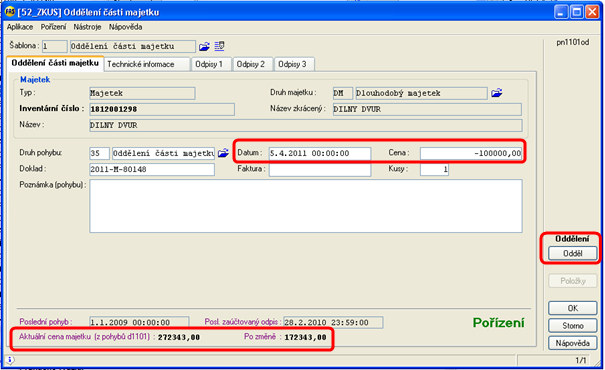 Pokud je oddělovaná části majetku v ceně bez haléřů -> jsou všechny částky (odpisová cena, oprávky) zaokrouhleny na celá čísla.