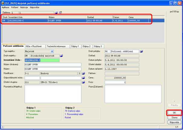 Otevře se okno Majetek pořízený oddělením, kde je předvyplněn pohyb 96 Pořízení oddělení - inventární číslo s označením písmene C.