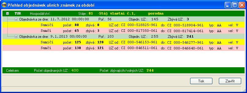 Funkce Objednávka duplikátů pracuje obdobně jako Objednávka nových ušních známek. Navíc obsahuje filtry (na stáj a kategorii zvířat) a tlačítko Hromadně pro rychlý výběr čísel zvířat.