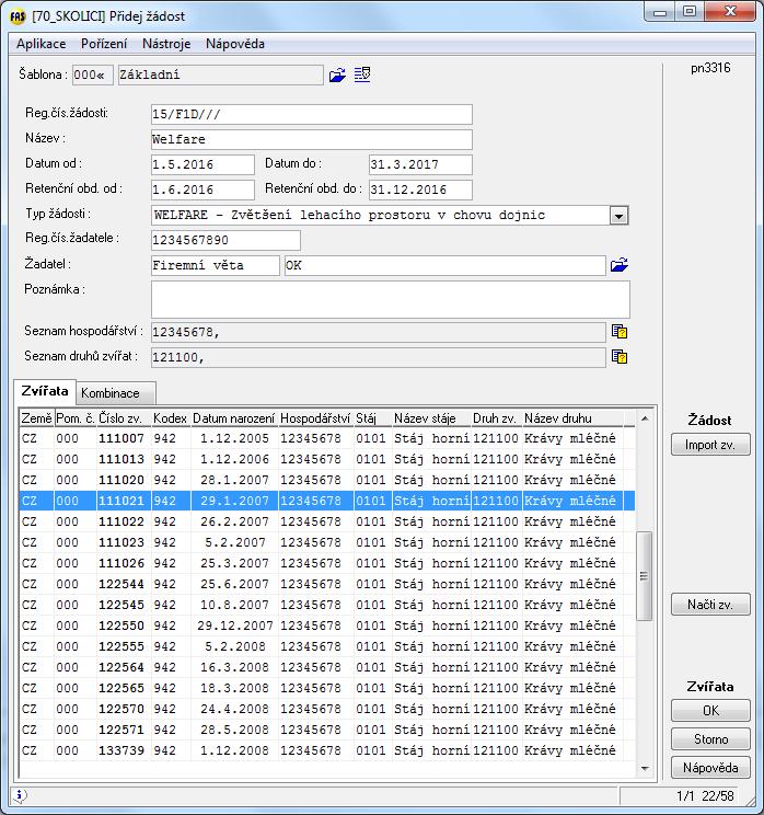 Pomocí funkce je možné založit evidenci jednotlivých podopatření dotačních titulů „Welfare“. Do hlavičky dokladu se vypisují údaje o žádosti a konkrétním podopatření, do spodní části ručně nebo importem deklarovaná zvířata. Pro pořízení čísel doporučujeme použít import (při importu se automaticky převezmou i čísla hospodářství a v případě rozdílů s evidenci je uživatel upozorněn na nesrovnalosti).