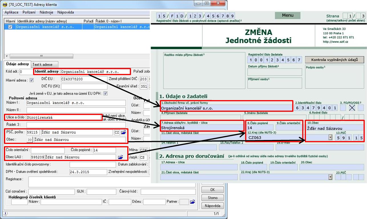 Do hlavičky formuláře Změna Jednotné žádosti, pro vyřazení zvířat, jsou automaticky doplňovány údaje žadatele zapsané v číselníku Adresy klienta: