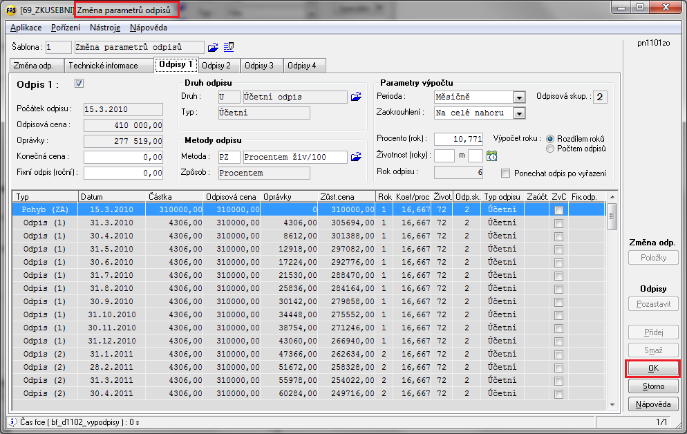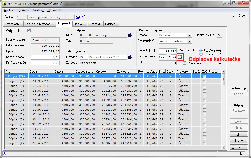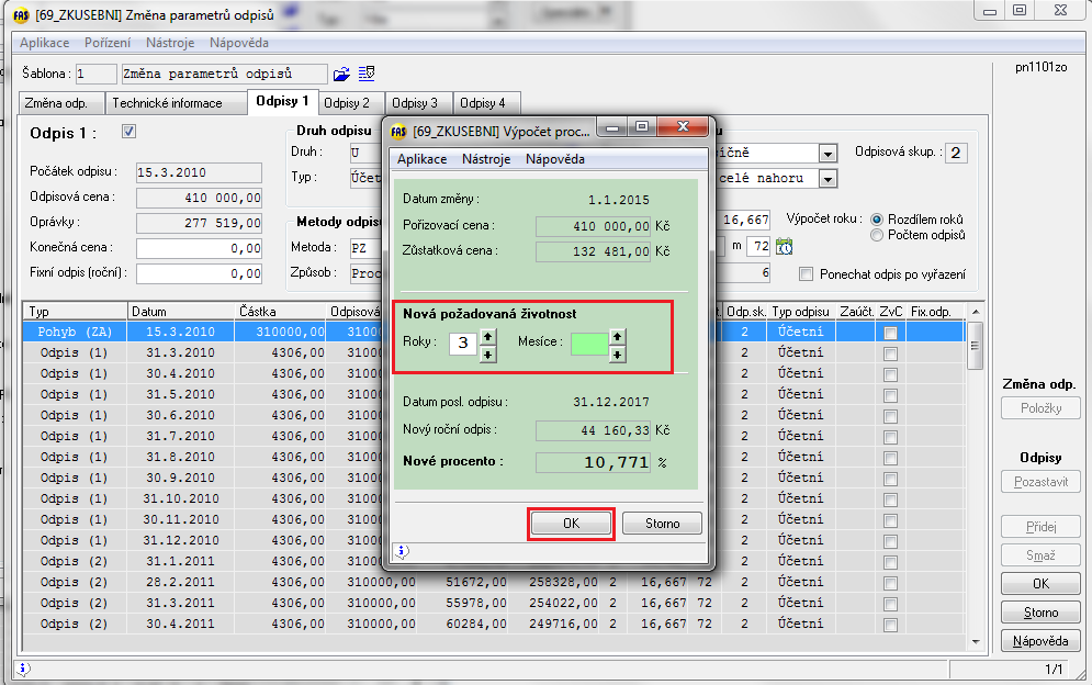 Nyní již stačí pouze uložit změnu parametru odpisů a životnost je od data provedení prodloužena.