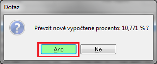 Po stisknutí tlačítka OK (po potvrzení vypočítaného nového procenta) se otevře dotaz, zda chcete opravdu převzít nové procento. Potvrzením se nové procento převezme k majetku a životnost bude prodloužena.